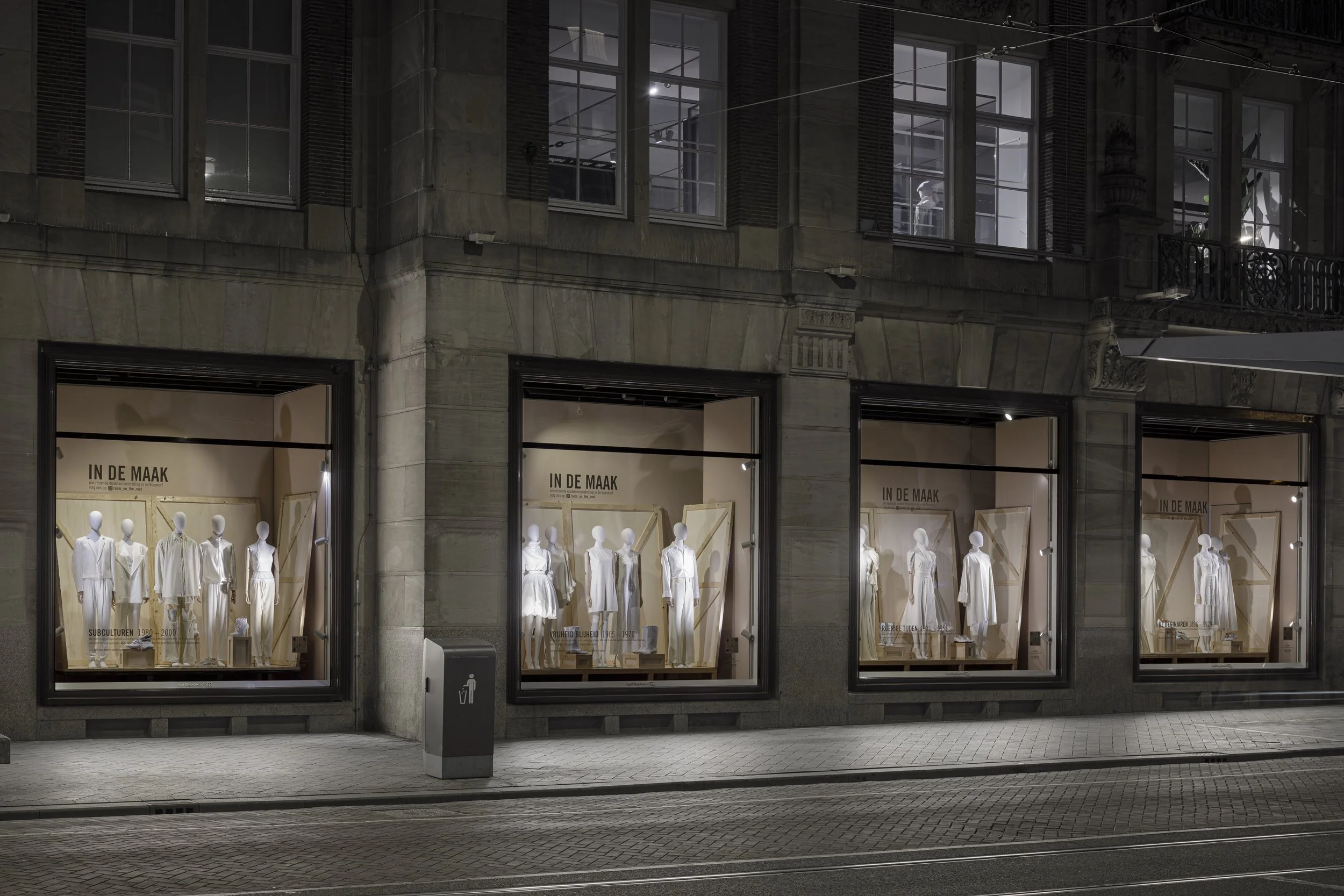 Traveling fashion exhibition (2021) taking over the windows of all seven de Bijenkorf department stores across the Netherlands, celebrating the retailer’s 150th anniversary. Titled In de Maak (In the Making), the exhibition offers a closer look at the creative process behind fashion, spotlighting emerging designers, artists, and craftspeople.